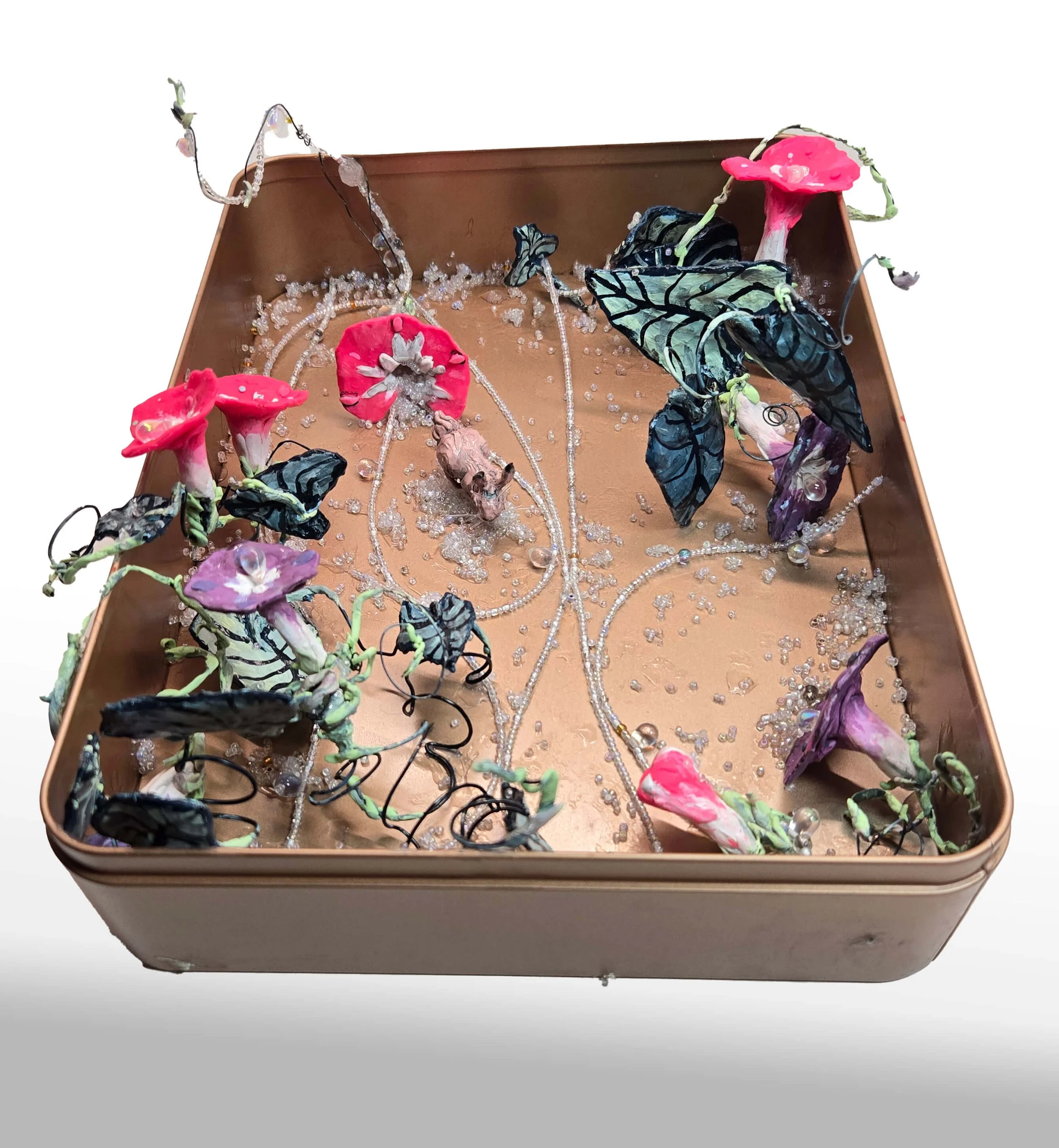 Near fluorescent flowers surround a pale pink rabbit in my ‘Comfort Garden’. Driven by their tangled nature curling vines grew from the wire-binding of a drawing pad are anchored into the mooncake tin by glistening beads and heart-shaped leaves.