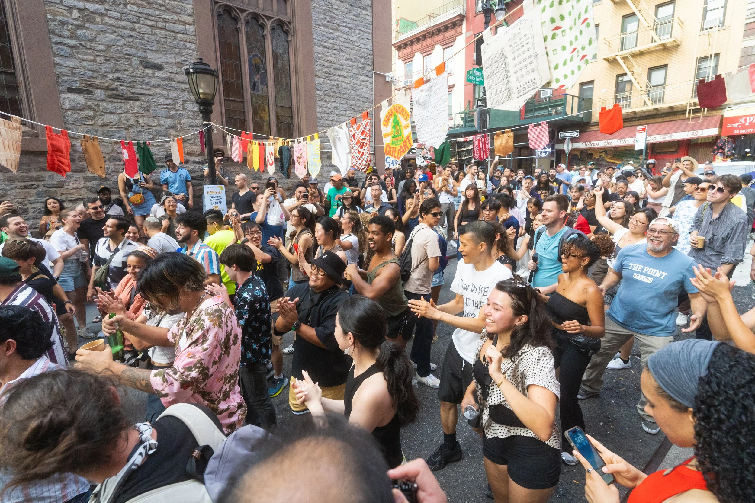 Block Party from 2024, with Artwork by Annika Cheng (also shown at MCNY). This interactive art installation by Annika Cheng proudly displays recycled textiles from the Chinatown community. Think!Chinatown Block Parties attendees were invited to contribute garments and textile remnants that hold a special significance in their lives.